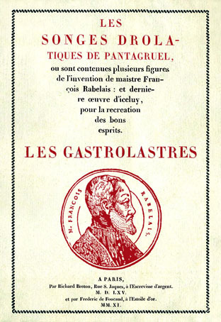 On y découvre le visage des célèbres personnages que Rabelais, écrivant alors sous le pseudonyme de “Maistre Alcofrybas Nasier, abstracteur de Quinte Essence”, avait dépeints dès 1532 en publiant son “Pantagruel roy des Dipsodes“, ouvrage lui-même inspiré de légendes folkloriques publiées la même année sous le titre des “Grandes et inestimables chroniques de Gargantua” dues à la plume d’un auteur non identifié…